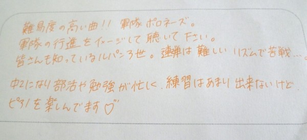本当に 忙しい毎日の中、ピアノを楽しんでいる と書いてくれた 中2の Aちゃん。